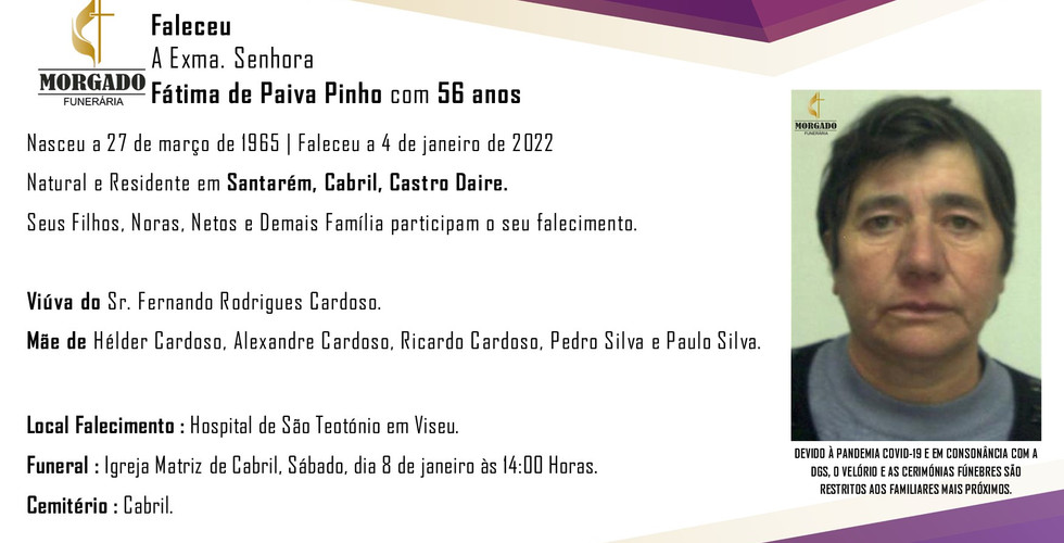 FALECEU a Sra. Fátima de Paiva Pinho com 56 Anos (Santarém, Cabril, Castro Daire)